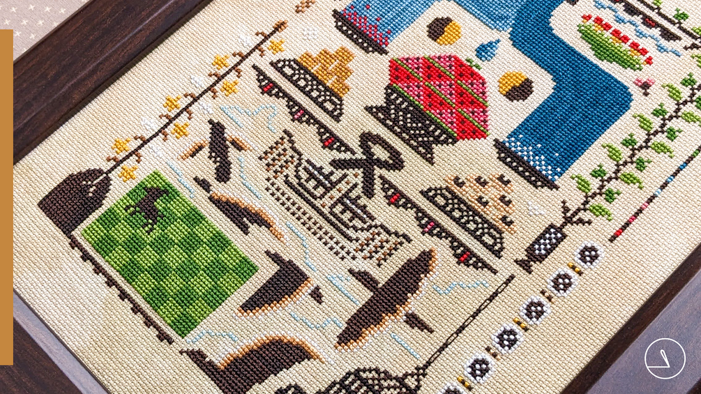 Model stitched 2 pulled strands over 1 fabric thread on 18 count Oatmeal aida by Fiber on a Whim.